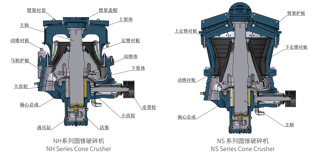NH/NS 系列圓錐式破碎機為單缸液壓結構,通過單個液斥缸升降動錐,實現了排礦口調整、清腔、過鐵和過載保護等多種功能;上下支撐的主軸支撐形式,比單點支撐受力更穩。設備按重型工況設計。破碎機在負載情況下,也能夠使用液壓調整破碎機出料口設置。排礦口自動化檢測補償系統,能夠穩定破碎腔壓力和恒定排放口。通過不同腔型的襯板選擇和偏心距的選擇,達到所需的理想產量和產品規格。可廣泛應用于砂石、冶金等行業的中碎、細碎作業。